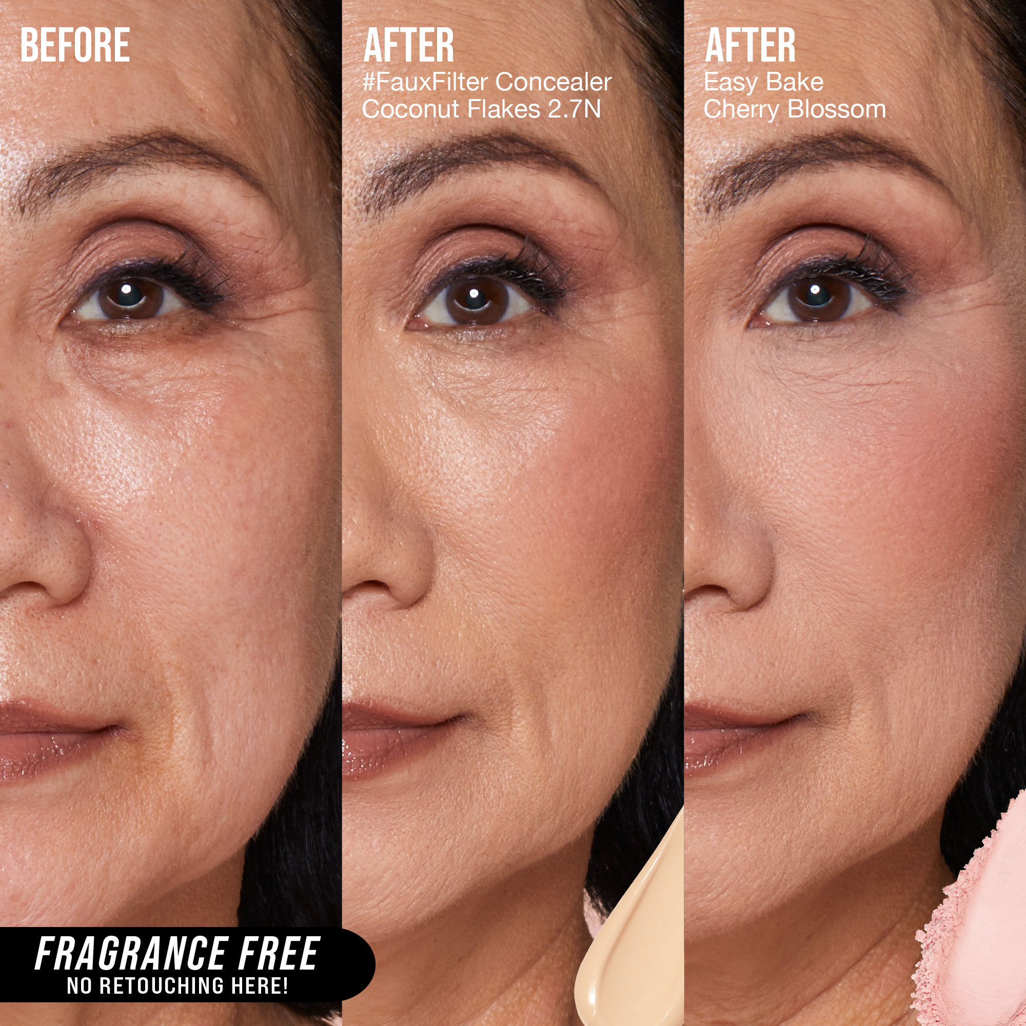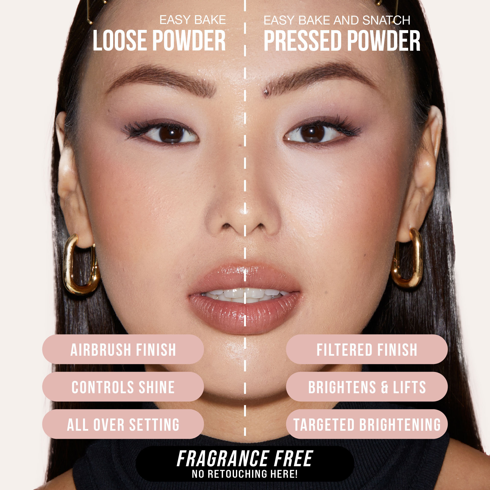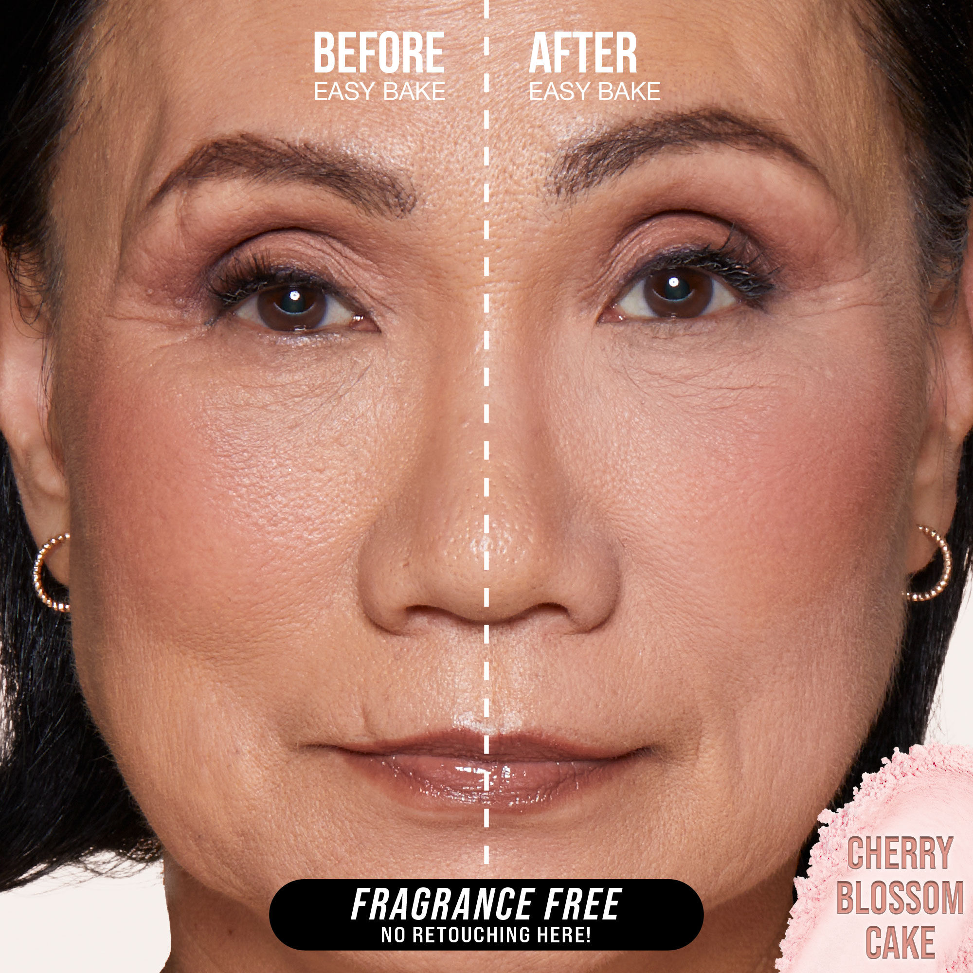 A dusting of Easy Bake leaves a translucent veil on the skin creating a matte finish that controls shine, color corrects, and highlights the different contours of the face without creasing or fading – the ultimate step to an airbrushed finish.